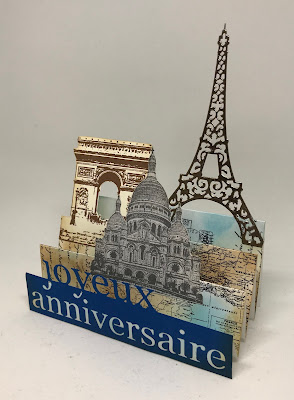The Sacre Coeur is from Darkroom Door, the Arc de Triomphe is an old Stampington stamp called Visit to Paris, the Eiffel Tower diecut is from La-La land Crafts, and the Joyeux Anniversaire (Happy Birthday) diecut is from Memory Box.